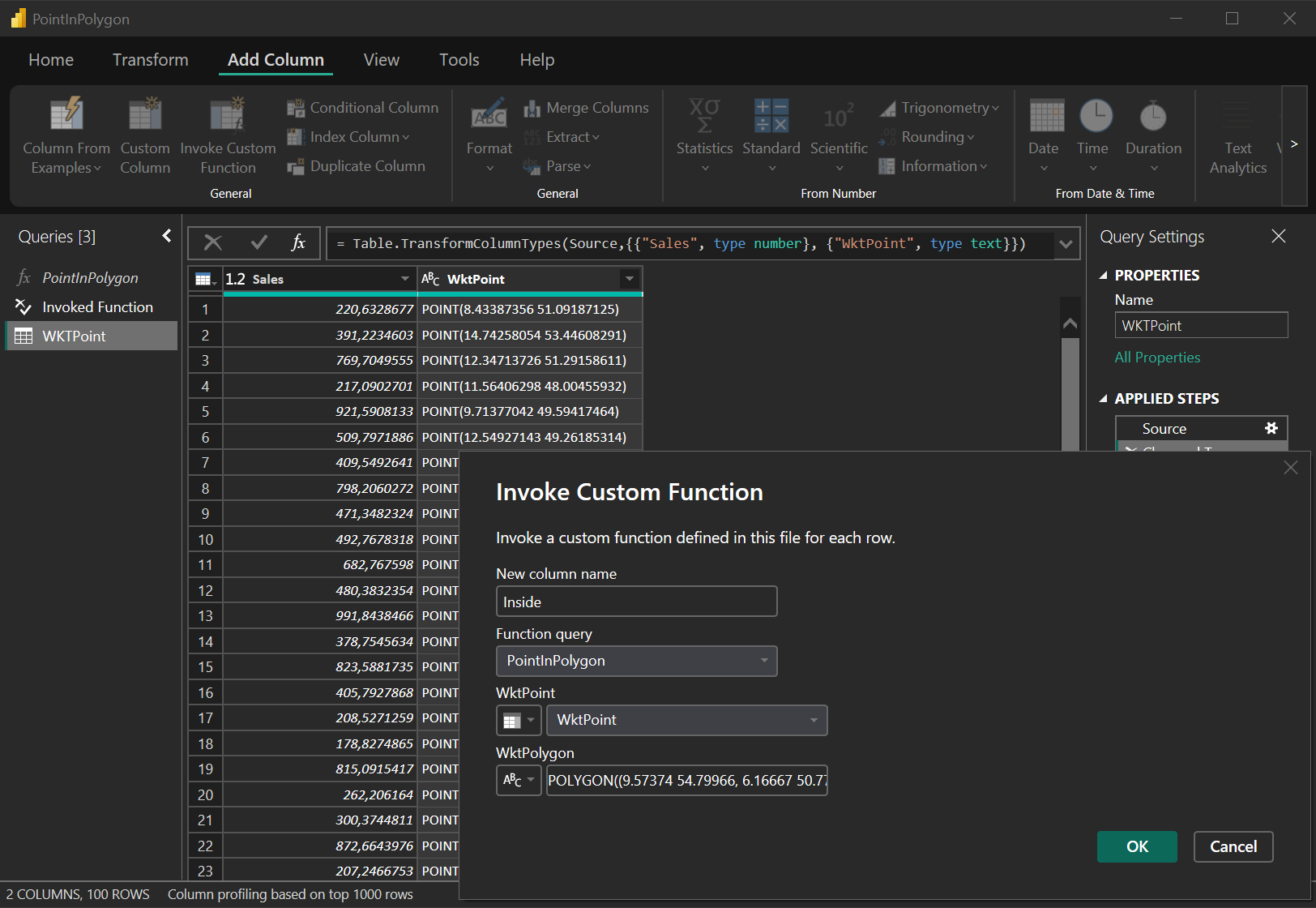 To test the function, click on the newly defined PointInPolygon function in Power Query. You’ll be prompted to enter values for the two parameters. Paste a WKT polygon and a WKT point, e.g. the examples from above, then click Invoke.